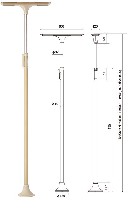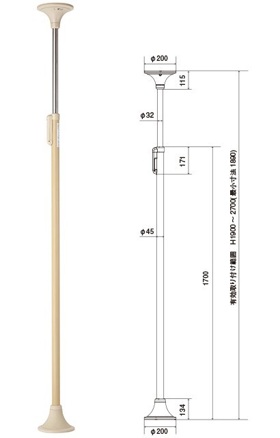 手すり部直径:4,5㎝ 天井高さ:190~270㎝ 天井ベース直径:20㎝